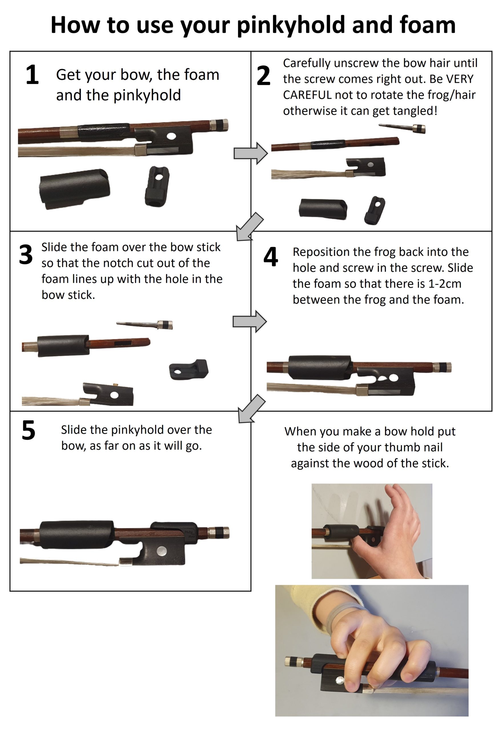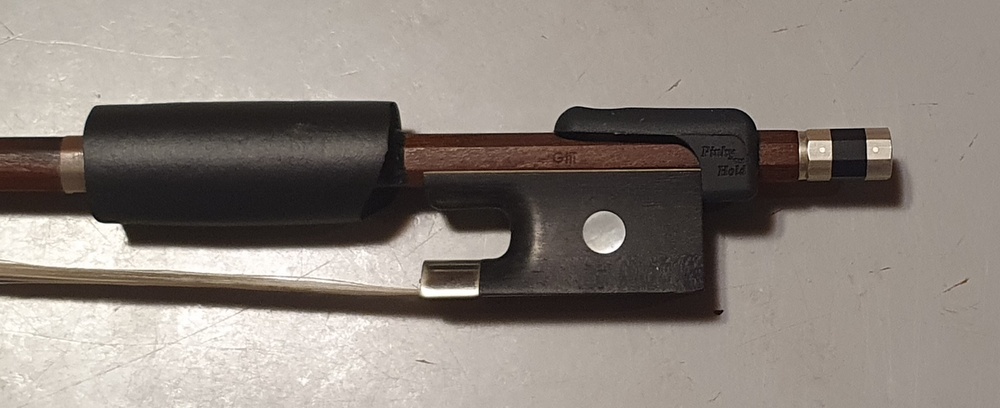 The pinkyhold slides over the end of the bow to provide somewhere for finger 4 (pinky finger) to sit. It really helps pinky finger to stay curved. It also helps the bow hand to stay in place and not slide up the bow. The pinky hold is made of black rubber.