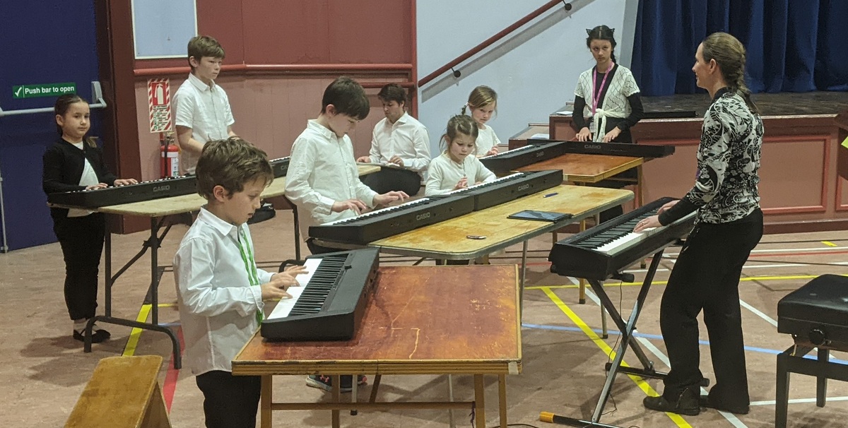Third and final day of classes. Although there were only 2 students properly enrolled for piano at this workshop, by the end we had another 5 participating in the group playing, as you can see in the photo above. The school has quite a few keyboards so it was nice that the children could have a keyboard each when we played our piano pieces at the play-out concert.